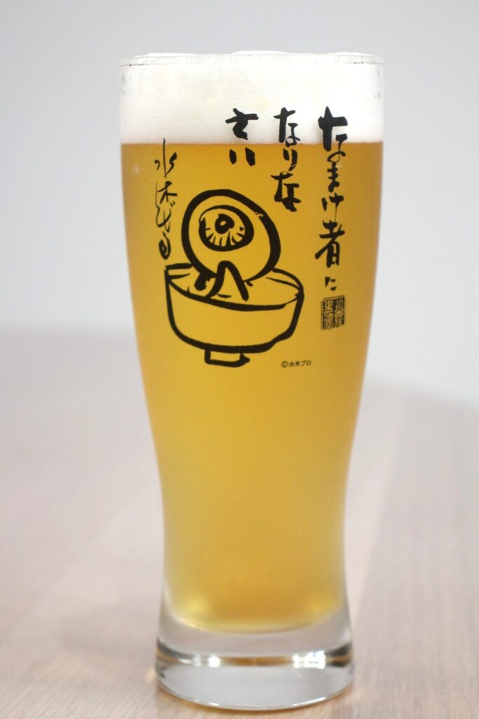 水木しげる先生の名言と目玉おやじのイラストが人気の「ビアグラス」と、ゲゲゲの鬼太郎の「鳥取限定手ぬぐい」が再入荷しました 。