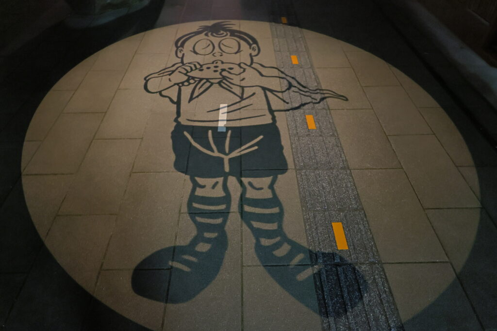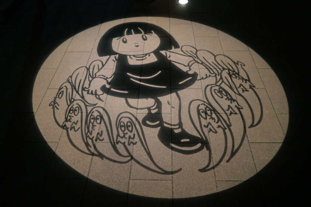 夜の水木しげるロードでは、「春休みバージョン」の妖怪影絵も投影中です。